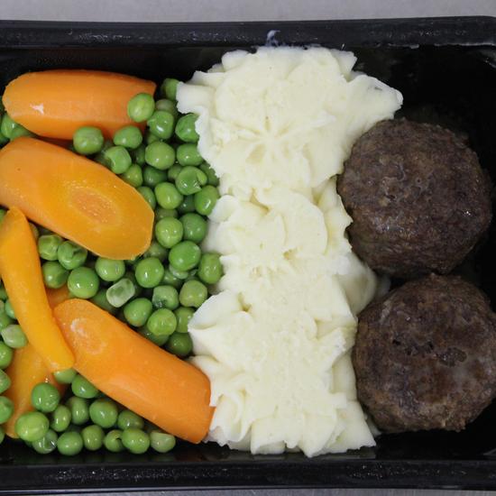 GEHAKTBAL MET DOPERWTJES, WORTEL EN AARDAPPELENPUREE